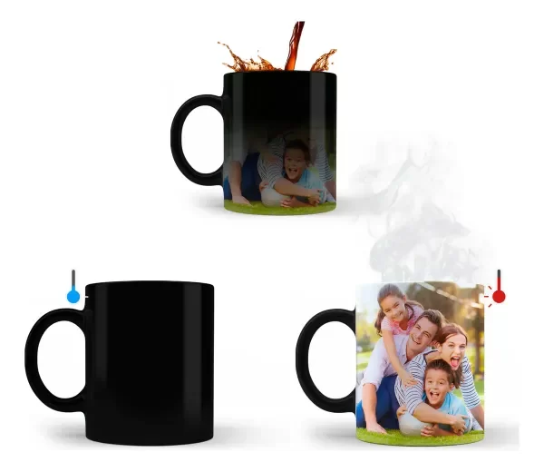 Cuando la taza esta en frio la taza se encuentra de color negro, dejando ver a trasluz que tiene algo estampado. Luego al entrar
